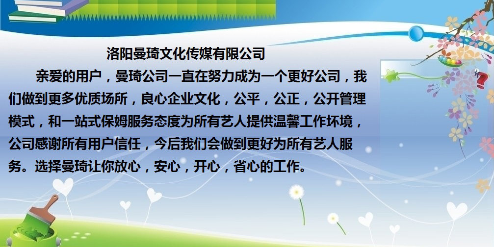 —— Introduction ——洛陽(yáng)曼琦文化傳媒有限公司親愛(ài)的用戶,曼琦公司一直在努力成為一個(gè)更好公司,我們做到更多優(yōu)質(zhì)場(chǎng)所,良心企業(yè)文化,公平,公正,公開(kāi)管理模式,和一站式保姆服務(wù)態(tài)度為所有藝人提供溫馨工作壞境公司感謝所有用戶信任,今后我們會(huì)做到更好為所有藝人服務(wù)。選擇曼琦讓你放心,安心,開(kāi)心,省心的工作。